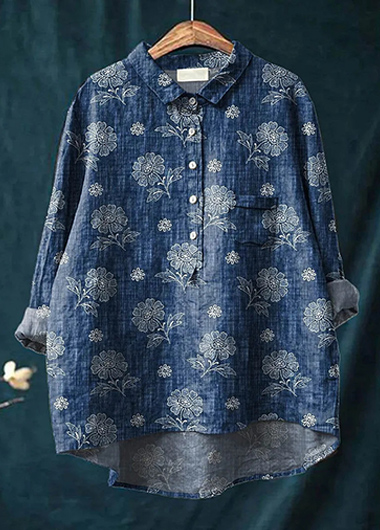Women's Cute Little Blue Flower Print Casual Cotton And Linen Shirt
