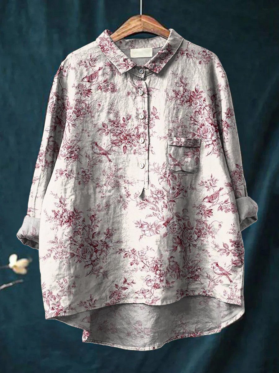 Women's Red Flower and Bird Print Casual Cotton And Linen Shirt