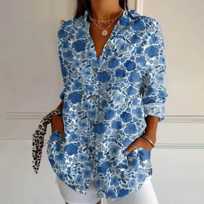 Autumn Casual Printed V-Neck Long Sleeve Button T-Shirt
