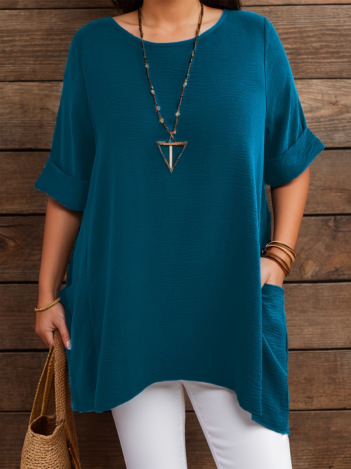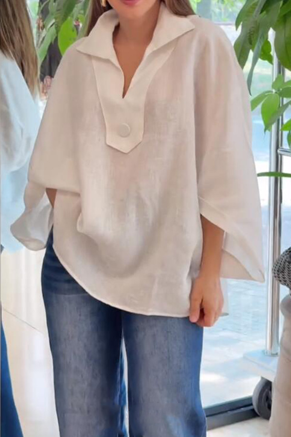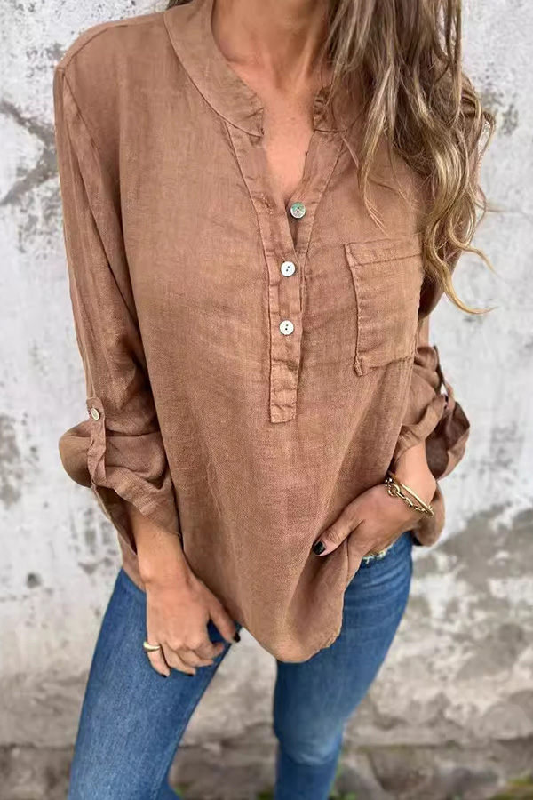 Autumn Solid Color Linen V-Neck Long-Sleeved T-Shirt